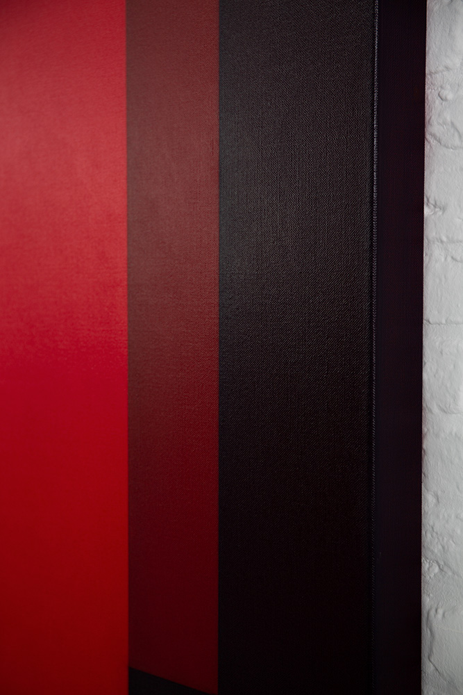 Ein leuchtend roter, vertikaler Balken in der Mitte tritt in Spannung zu einer dunkleren Randzone, während der Übergangsbereich zwischen beiden Farbfeldern eine vibrierende optische Zone erzeugt.