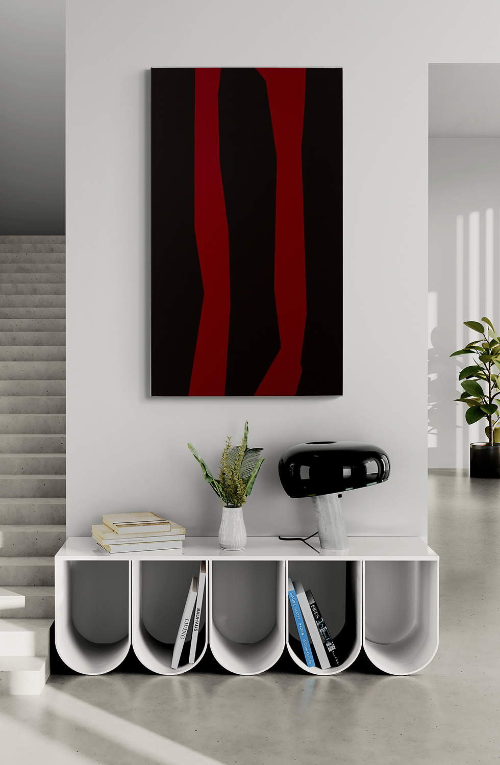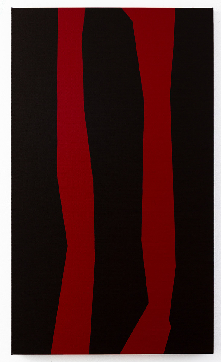 Gemälde: Abstrakt, zwei rote Flaechen, die sich vertikal über einem dunklen Feld ausbreiten. Minimalistische abstrakte Farbfeldmalerei.