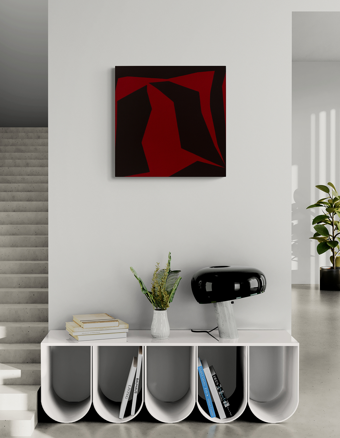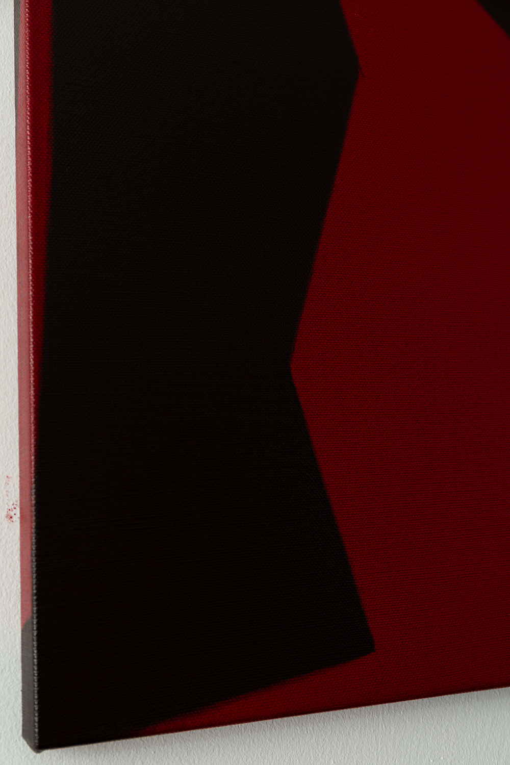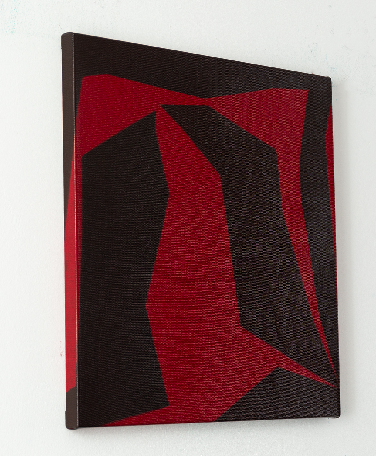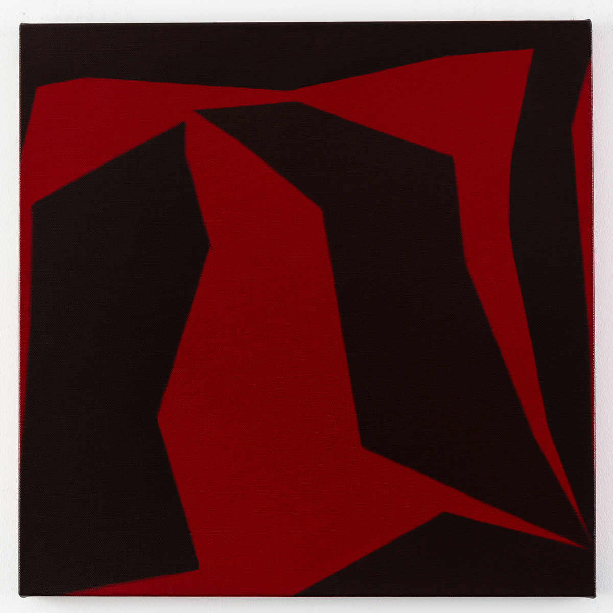 Gemälde: Abstrakt, mit roten und schwarzen Formen, die sich ineinander verschränken. Minimalistische abstrakte Farbfeldmalerei.