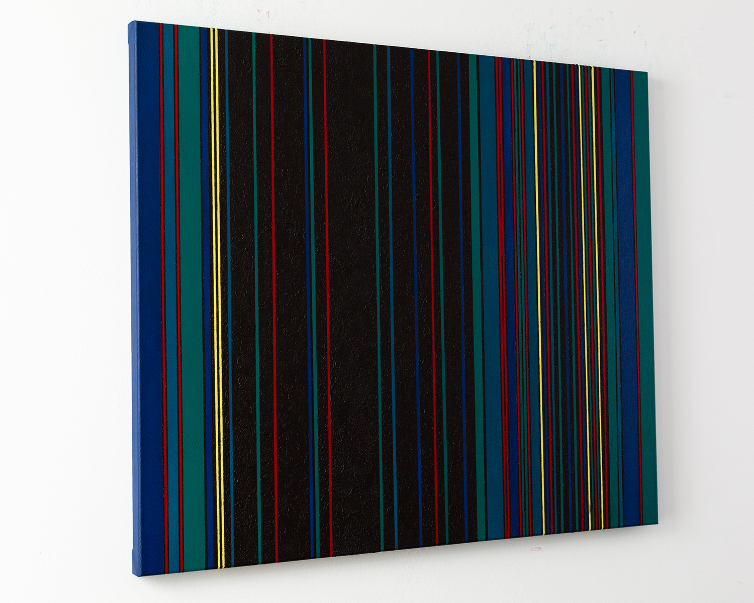 Gemälde: Geometrisch, abstrakt mit senkrechten blauen, grünen, roten, schwarzen und gelben Streifen. Minimalistische Streifen Farbfeldmalerei.